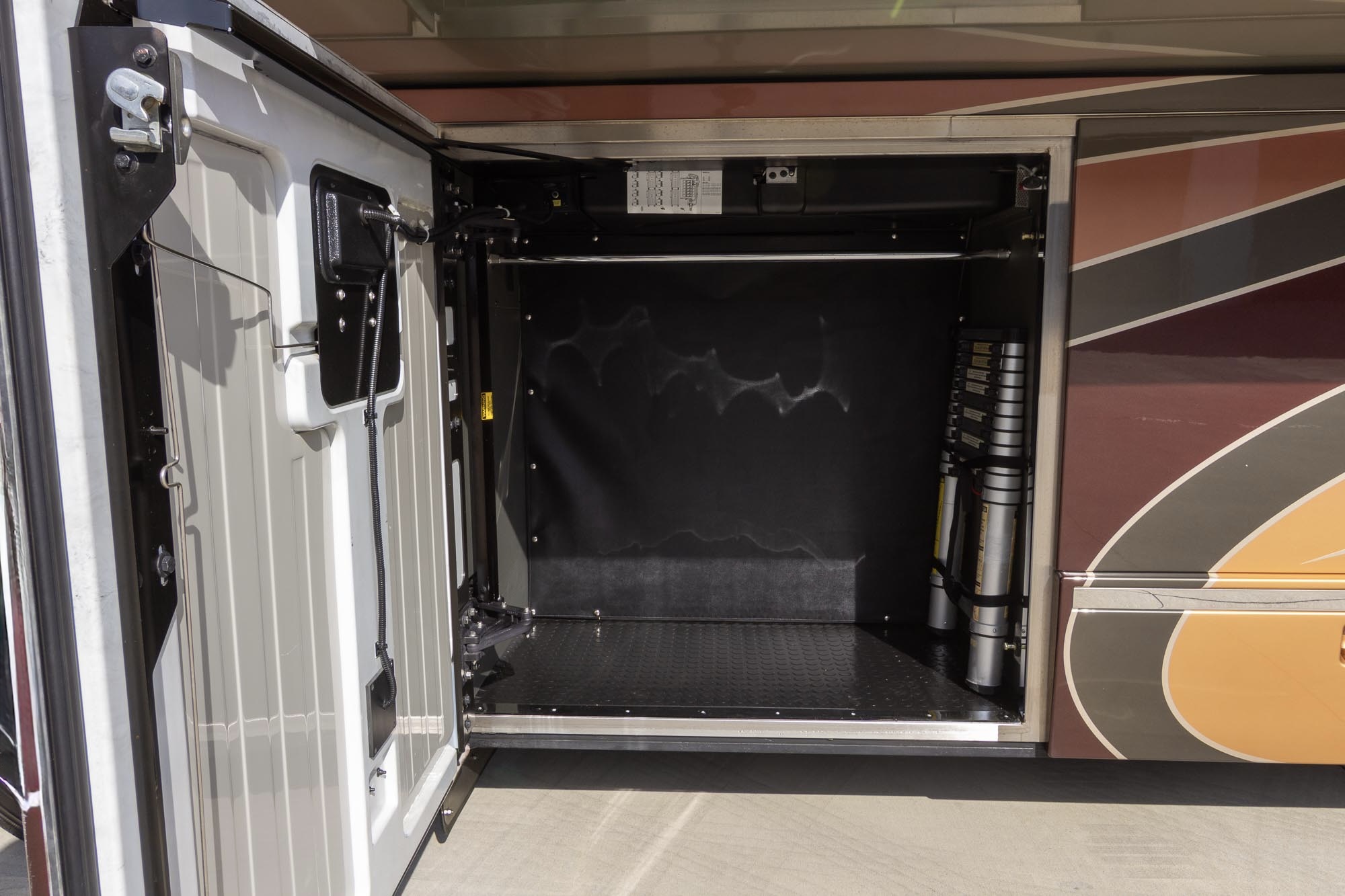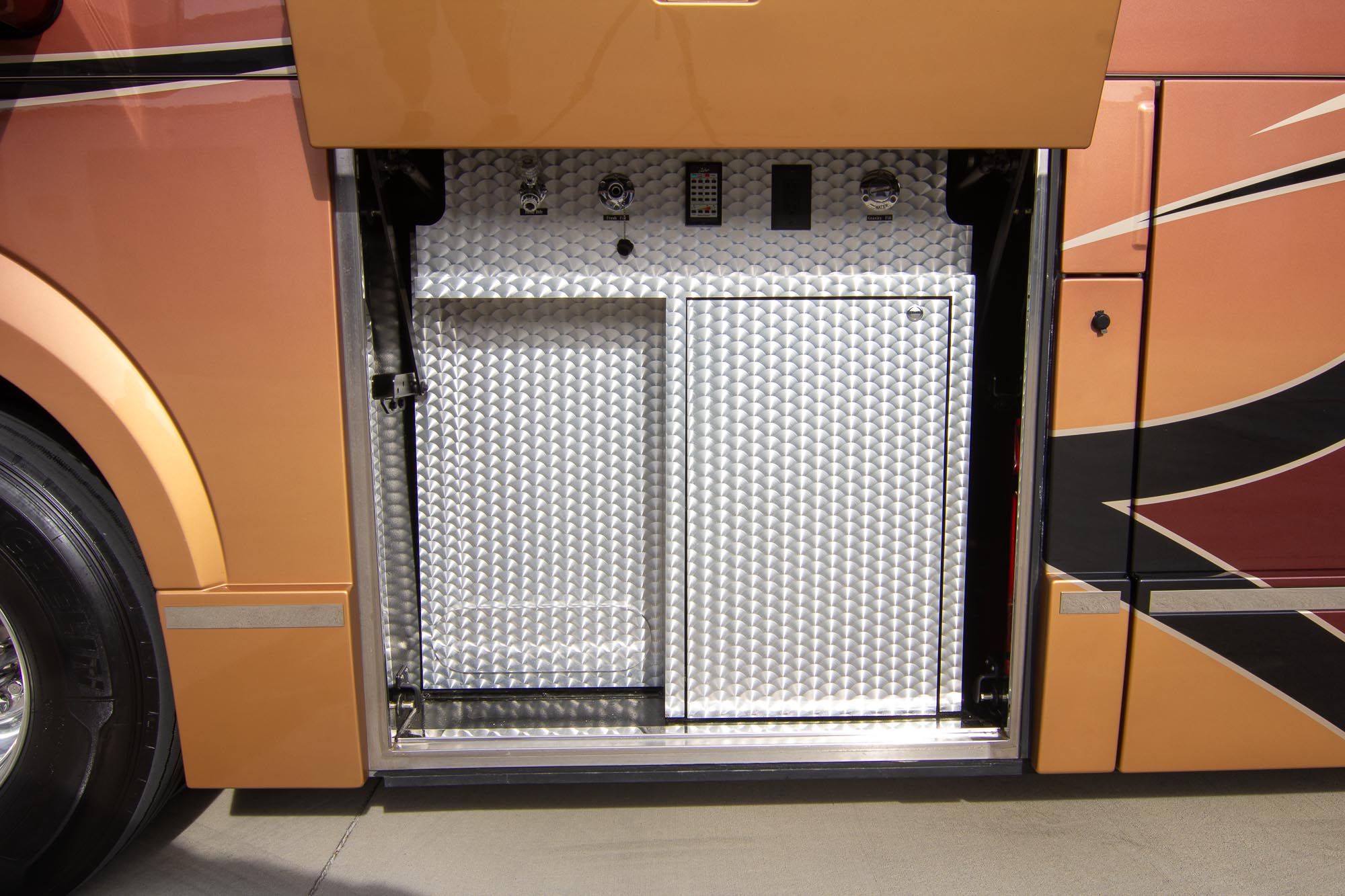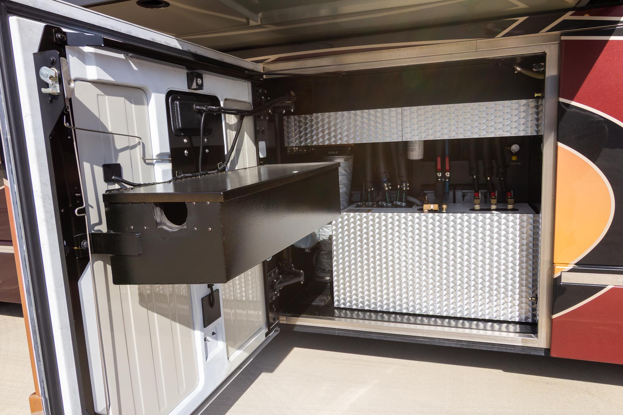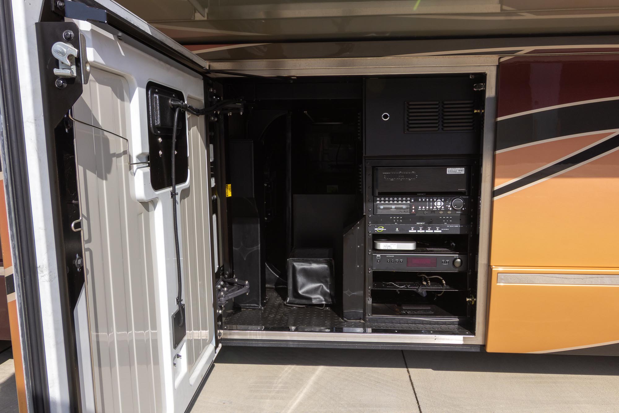 L- dinette, 4ea.Outback 3,500 watt inverters, Two burner stove, Granite shower, TV in the bedroom, Fold-down TV in the Living room, Air leveling, All electric coach, Stack washer/ Dryer, Volvo D13 Engine, Allison 6 speed transmission, 20 KW generator, Roof mounted awnings,