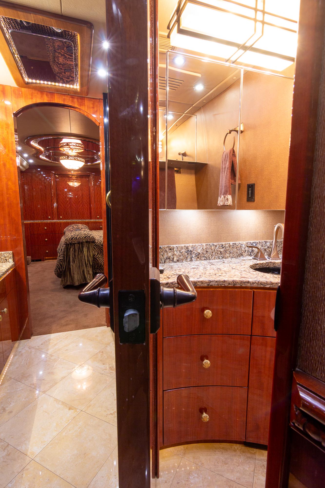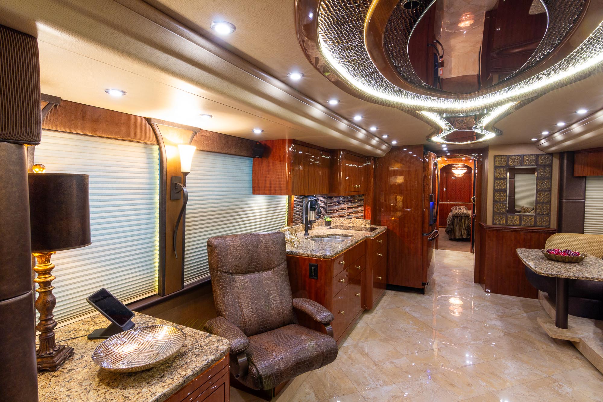 It's an extremely nice clean coach. Tile flooring throughout the front of the coach, Custom counter top, and sink, Sofa, Euro recliner,